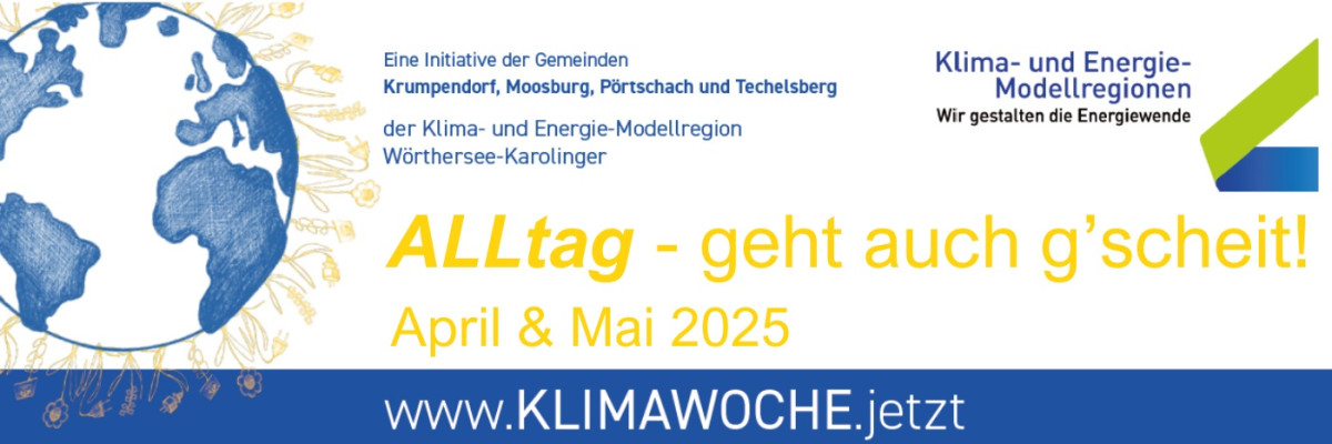 Die Gemeinden Krumpendorf, Moosburg, Pörtschach und Techelsberg laden herzlich zu den fünften Klimawochen unter dem Motto „ALLtag – geht auch g’scheit!“ ein. Im April und Mai 2025 erwarten die Besucher:innen inspirierende Veranstaltungen rund um Energieeffizienz, nachhaltigen Konsum und gemeinschaftliches Handeln für den Klimaschutz.