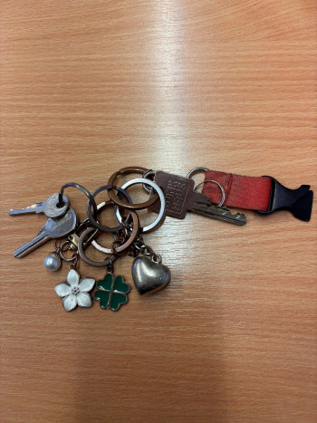 1/2026: Schlüsselbund mit 1 Haustürschlüssel und 2 weiteren Schlüsseln. Anhänger: Herz, Kleeblatt, Blume, Perle & Teil eines Schlüsselbandes