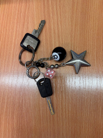 2/2026: Schlüsselbund mit 2 Schlüsseln: 1x Haustürschlüssel & 1x kleinerer Schlüssel. Anhänger: Bowlingkugel „8“, silber Stern, rosa Würfel.